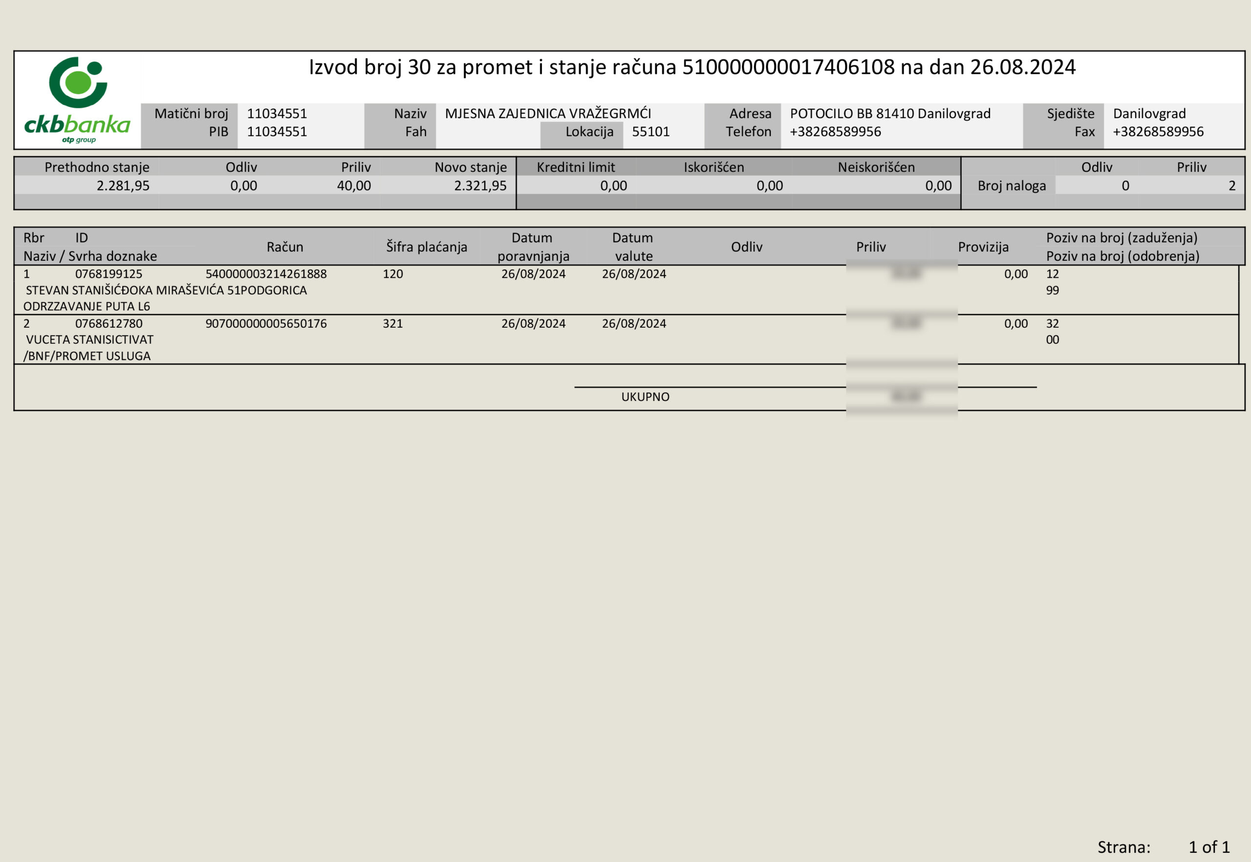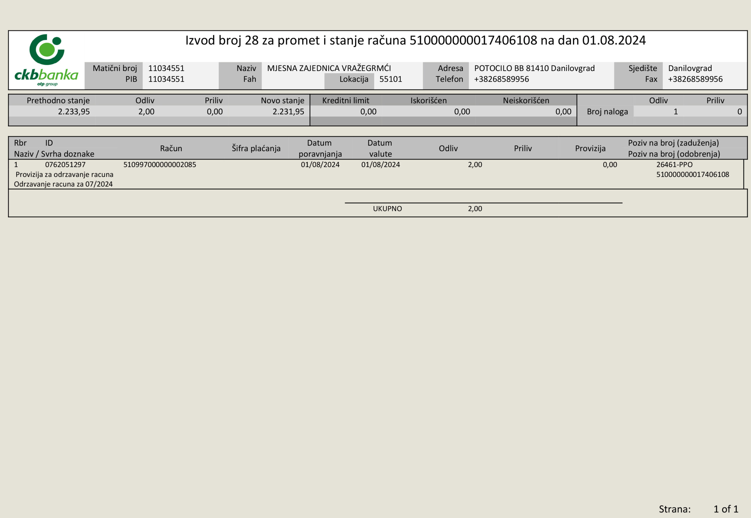 Žiro račun Mjesne zajednica Vražegrmci 510 – 174061 – 08 kod CKB Banke
