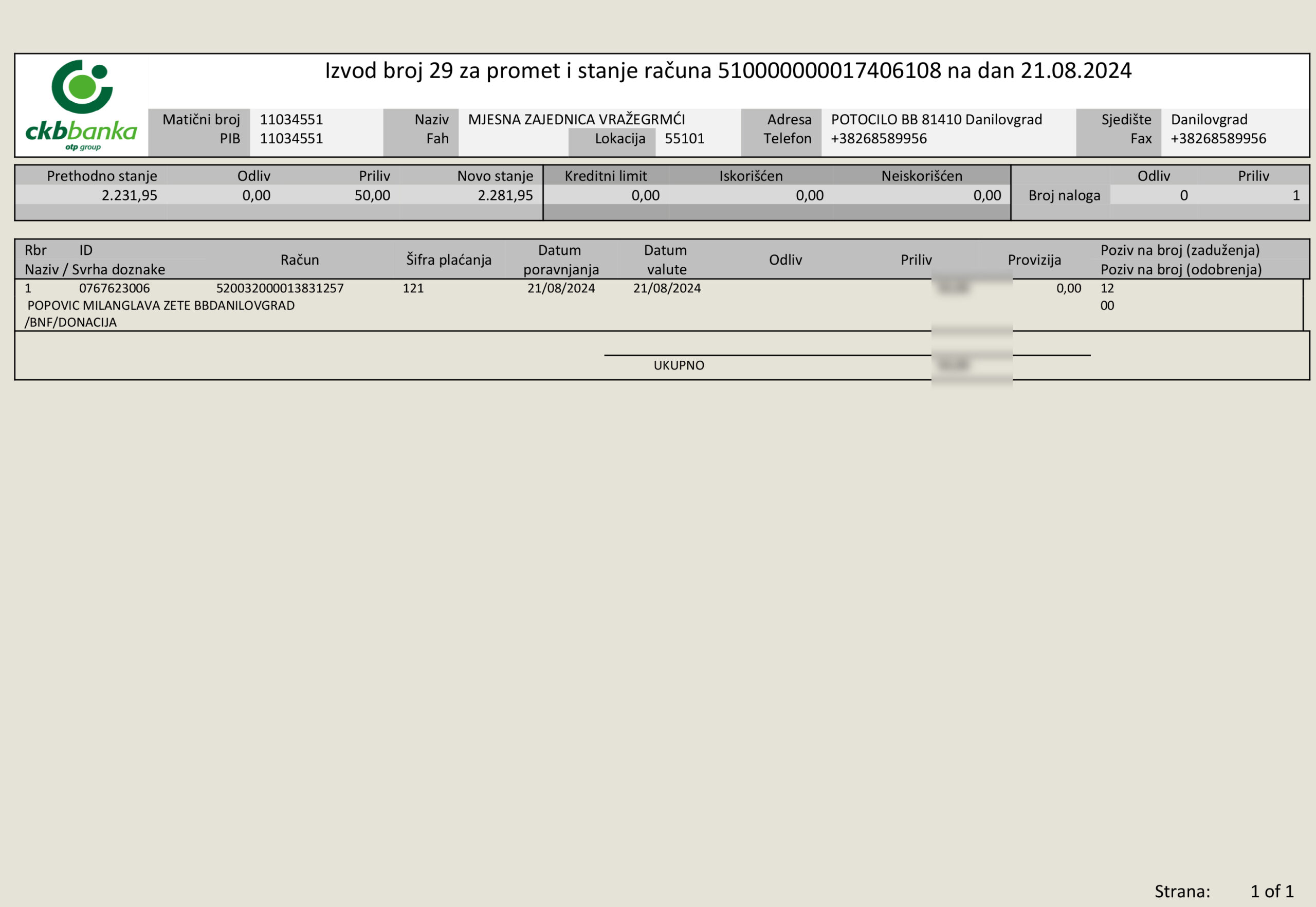 U nastavku izvod sa žiro računa, zaključno sa poslednjom uplatom. Pojedinačni iznosi donacija, kao i lični podaci su sakriveni poštujući privatnost lica.