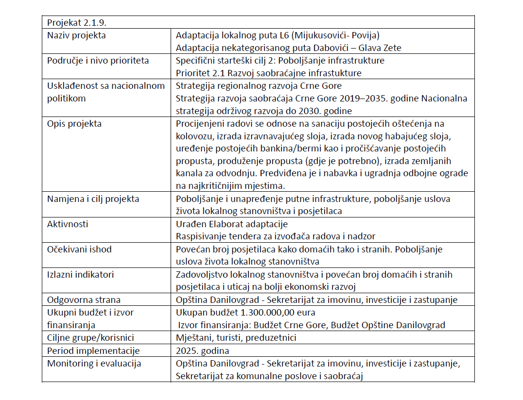 Prethodno navedeni projekti (L6 i Vodovod) su u takozvanoj zreloj fazi tj. imaju pripremljenu tehničku dokumentaciju odnosno elaborate. Projekti ne zahtjevaju procese eksproprijacije pa je i to jedan od razloga zrelosti ovih projekata uz, kako smo naveli, izrađenu dokumentaciju. Preostalo je da se obezbijede sredstva i započne realizacija ovih projekata – što je zbog faze u kojoj se nalazi značajno lakše. Tu činjenicu potvrđuje i uključivanje ovih projekata u Strateški plan razvoja Opštine Danilovgrad.